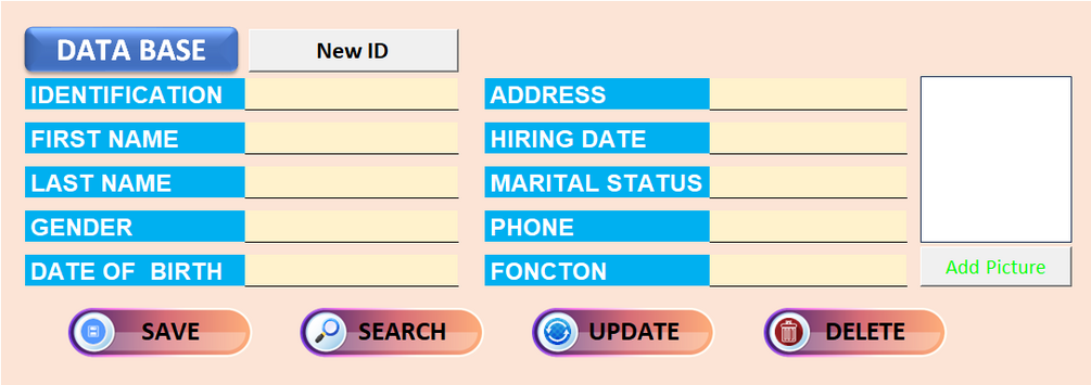 database management system aimed at handling personal information. This interface includes various fields for entering details such as identification, first name, last name, gender, date of birth etc...